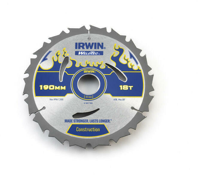 IRWIN Kézi körfűrészlap fához 190/30mm 18ATB HEGESZTETT KARBID KEMÉNYFÉMBŐL KÉSZÜLT FOGAK 30%-kal erősebb kötést biztosítanak a fűrészlaptesttel és 50%-kal hosszabb élettartamot eredményeznek ULTRAKOMAPKT KARBID ANYAG 70%-kal keményebb mint standard változata, amely kíváló minőségű éles vágást eredményez INNOVATÍV FURATOKKAL A HŐELVEZETÉSRE KIALAKÍTVA TELJES FEL