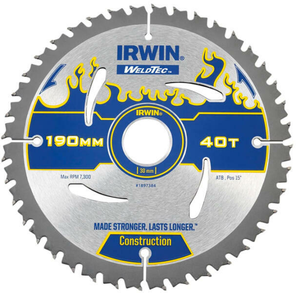 IRWIN Kézi körfűrészlap fához 190/30mm 40ATB HEGESZTETT KARBID KEMÉNYFÉMBŐL KÉSZÜLT FOGAK 30%-kal erősebb kötést biztosítanak a fűrészlaptesttel és 50%-kal hosszabb élettartamot eredményeznek ULTRAKOMAPKT KARBID ANYAG 70%-kal keményebb mint standard változata, amely kíváló minőségű éles vágást eredményez INNOVATÍV FURATOKKAL A HŐELVEZETÉSRE KIALAKÍTVA TELJES FEL