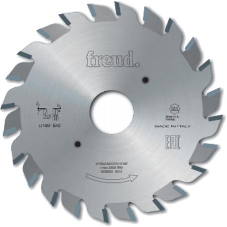 Bevált fűrészlap előfűrészekhez. Lemez trapéz alakú fogakkal és tágulási hornyokkal. Kiváló minőségű laminált és forgácslapos vágásokhoz tervezték. A keményfém fogakat a nagy tartósság jellemzi. Felhasználás: Ideális a méretvágásra, elővágással szálka nélküli felületet biztosít. Gépek: Asztali fűrészgép, vízszintes vagy függőleges gépek és méretrev