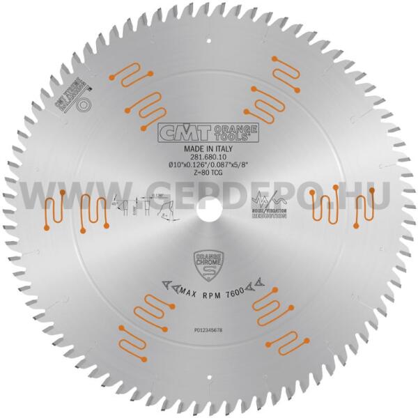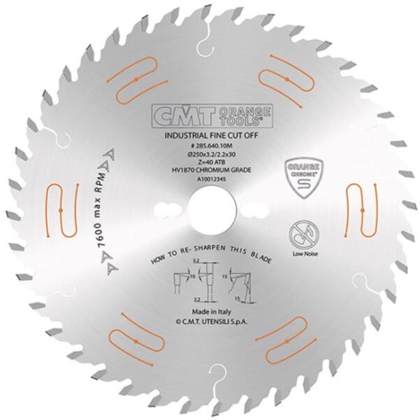 CMT alacsony zajszintű, krómozott körfűrészlap bútorlapokhoz és finom vágásokhoz 250mm f:30 Z80 Kiváló minősígű, hosszú életű fűrészlap méretre vágáshoz, elővágó használatával. Krómozott felülettel, zajcsillapított kivitelben. Ajánlott egy és kétoldalas laminált bútorlapokhoz, furnérozott táblákhoz, formatizáló és asztali körfűrészekhez. Fűrészlap átm