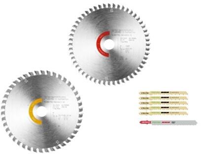 Woodworking készlet: kombinált megoldás kör- és szúrófűrésszel végzett munkákhoz. Teljes körű famegmunkálás akciós csomagban: a Woodworking készlet a tökéletes összeállítás a zökkenőmentes munkafolyamatokhoz az asztalos, burkoló és famegmunkáló iparágakban. Ez a készlet két különböző körfűrészlapot és hat szúrófűrészlapot tartalmaz minden alkalmazáshoz