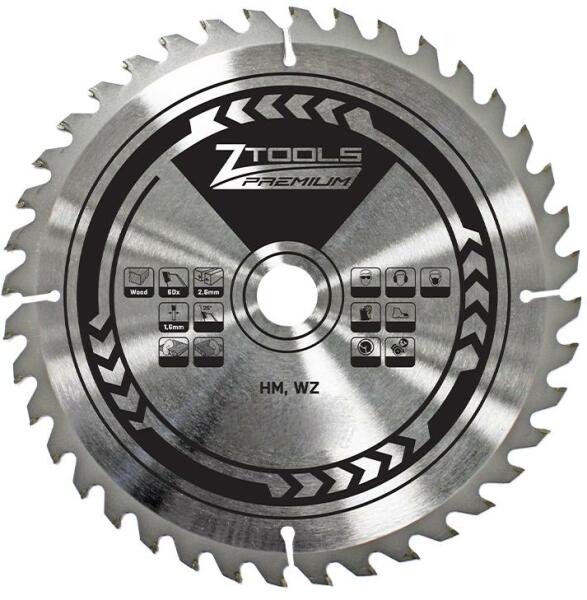 Z-TOOLS Faipari körfűrészlap - keményfém váltó fogazattal HM Faipari keményfémlapkás (HM) körfűrészlap, vegyes használatra Váltó fogazattal Elsősorban természetes fa hossz- és keresztirányú vágásához Volfrám-karbid keményfém fogakkal ellátott körfűrész tárcsa Átmérő: 250 mm Furat: 30 mm Fogszám: Z=40