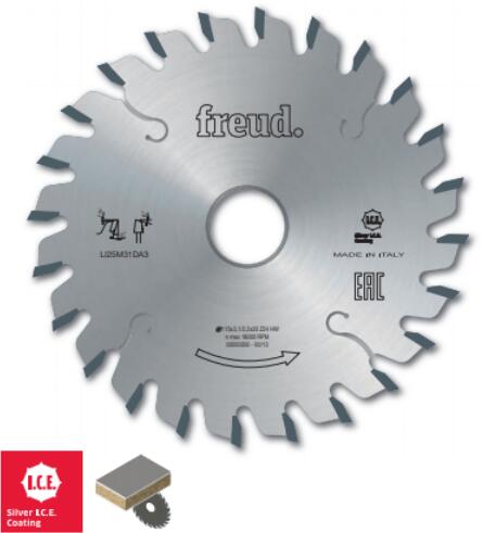 A bevonat elővágására kétoldalon bevonatos paneleknél. Gépek : Vízszintes táblafelosztó gépek, amelyek lehetővé teszik az elővágó függőleges állíthatóságát a táblafelosztó fűrész vágási szélességéhez. Jellemzők : 6°-os váltakozó fogazat pozitív homlokszöggel. Anyagok : Kétoldalon bevonatos forgácslap vagy MDF panelek. D: átmérő B: fogvastagság d: furat Z