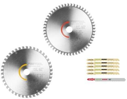 Woodworking készlet: kombinált megoldás kör- és szúrófűrésszel végzett munkákhoz. Teljes körű famegmunkálás akciós csomagban: a Woodworking készlet a tökéletes összeállítás a zökkenőmentes munkafolyamatokhoz az asztalos, burkoló és famegmunkáló iparágakban. Ez a készlet két különböző körfűrészlapot és hat szúrófűrészlapot tartalmaz minden alkalmazáshoz