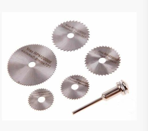 Körfűrészlap készlet 6 részes fúrógépbe 22 - 25 - 32 - 44 mm + fúrógép adapter 3,17 mm Felhasználás: fa, műanyagok, vékonyfalu csövek stb. vágására Max. 20000 fordulat Kód:073416