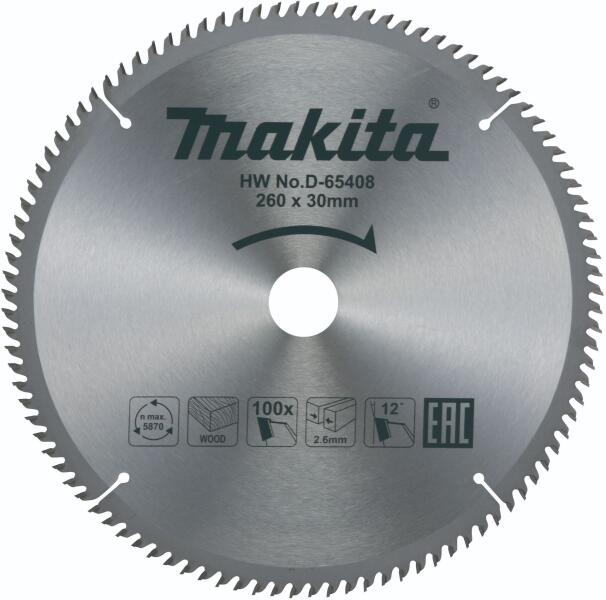 Jellemzők: Makita körfűrésztárcsa gérvágáshoz Kiváló vágási minőség Finom vágású, sűrű fogazású fűrészlap Műszaki adatok: Fog vastagság: 2,6 mm Fogszám: 100 Furatátmérő: 30 mm Maximális fordulat: 5.870/perc Szög: 12° Tárcsaátmérő: 260 mm