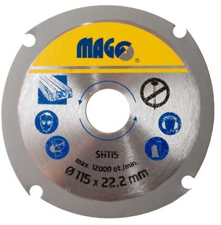 MAGG maró vágó korong vágótárcsa marótárcsa fához 115mm SH115 A termék jellemzői: Ideális fa és műanyag vágásához. Bármilyen sarokcsiszolóval használható. Gyors, könnyű és pontos fafeldolgozás A fogak élezése nagyon gyors és egyszerű. Korongátmérő: 115m Belső furatátmérő: 22,2 mm Max. fordulat: 12000 ford/perc