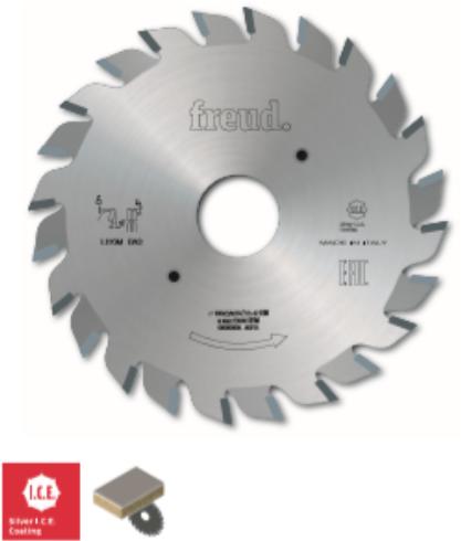 A bevonat elővágására kétoldalon bevonatos paneleknél. Gépek: Vízszintes táblafelosztó gépek, ahol az elővágás mélysége nem állítható. Legnagyobb elővágási mélység 2 mm. Jellemzõk: 5°-os váltakozó fogazat pozitív homlokszöggel. Anyagok: Kétoldalon bevonatos forgácslap vagy MDF panelek
