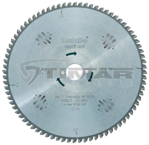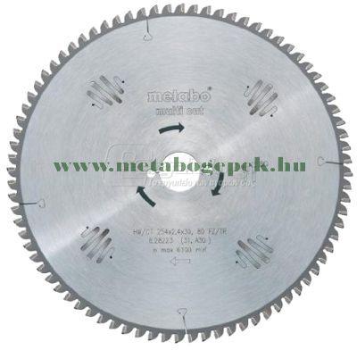 Metabo Körfűrészlap HW/TC, 216x30, 60 FZ/TZ (628083000) Univerzálisan használható igényes anyagokhozA minden igényt kielégítő vágásminőségért, pl. laminált, vékony falú műanyag, alumínium, vörösréz és sárgaréz profilokhozIdeális számos belső térben végzett alkalmazáshozTökéletes vágáseredmények tömörfában, nyers, bevonatos vagy furnérozott farostlemezekben