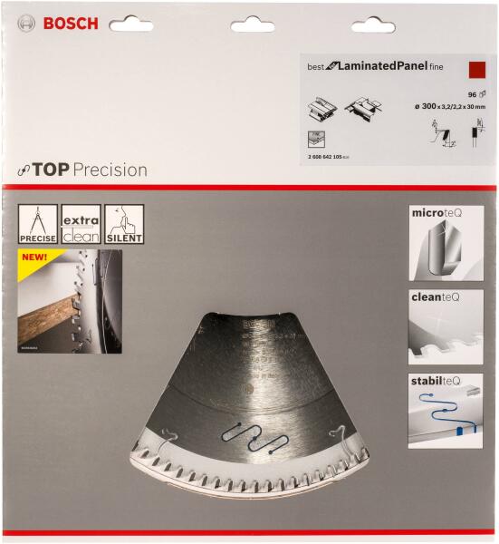 A Top Precision Best for Laminated Panel Fine körfűrészlap laminált panelek műveletei során ipari minőséget biztosít Cleanteq bevonata az anyagmaradványok tapadásának csökkentésével hidegen tartja a fűrészlapot, és védi a korróziótól A teljesítményt javítja a Bosch egyedi, nagyon tartós keményfém szemcsékből készülő extrakemény Microteq fogazata A Stabilteq poliur