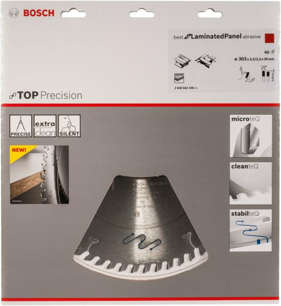 A Top Precision Best for Laminated Panel Fine körfűrészlap laminált panelek műveletei során ipari minőséget biztosít Cleanteq bevonata az anyagmaradványok tapadásának csökkentésével hidegen tartja a fűrészlapot, és védi a korróziótól A teljesítményt javítja a Bosch egyedi, nagyon tartós keményfém szemcsékből készülő extrakemény Microteq fogazata A Stabilteq poliur
