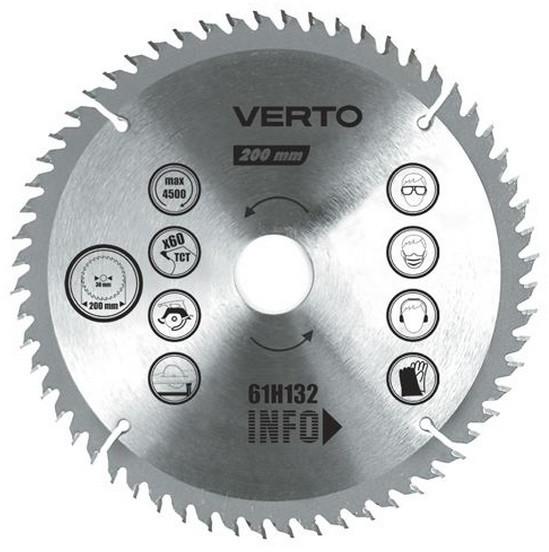 A csökkentett tárcsavastagságú VERTO vídia fűrésztárcsa nagyobb vágási sebesség elérését teszi lehetővé. Az YG8A vídiabetétes fogazás lehetővé teszi a fa és faalapú anyagok, mint pl. a rétegelt lemez, a forgácslap vagy az MDF lapok nagyoló vágását. A csomagolásban megtalálható szűkítő gyűrűk lehetővé teszik a fűrésztárcsák alkalmazását a fűrészgép t