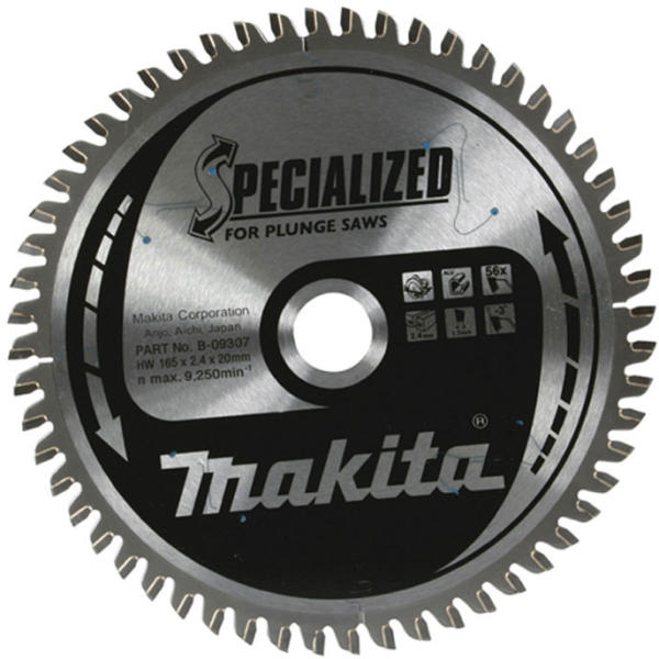 Makita körfűrészlap alu 165x20mm Z56 (B-09307) Speciális tárcsa merülő körfűrészhez. Ezen fűrésztárcsák kimondottan merülő körfűrészekhez lettek fejlesztve. Tiszta és egyenletes vágás fában, ez a fő jellemzője a Specialized tárcsáknak. A Makblade Plus- hoz hasonlóan ezek a lapok is a szabadalmazott vibrációcsökkentéses tulajdonsággal bírnak. Az ilyen tárcsa könn