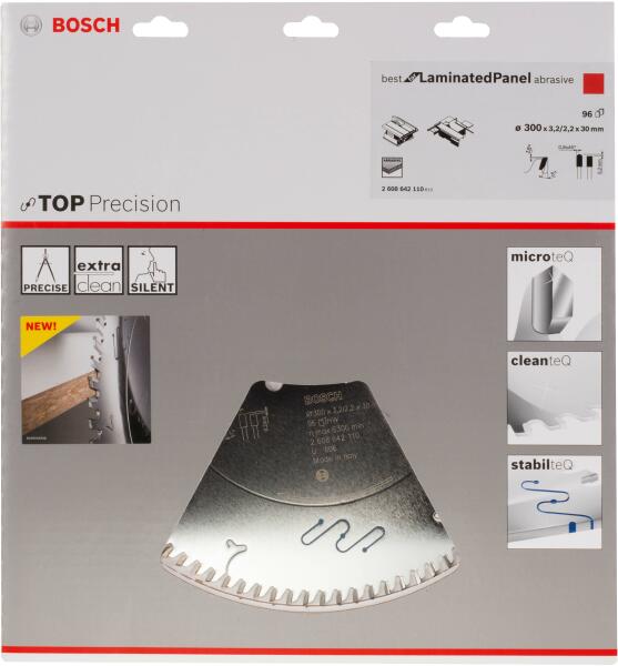 A Top Precision Best for Laminated Panel Fine körfűrészlap laminált panelek műveletei során ipari minőséget biztosít Cleanteq bevonata az anyagmaradványok tapadásának csökkentésével hidegen tartja a fűrészlapot, és védi a korróziótól A teljesítményt javítja a Bosch egyedi, nagyon tartós keményfém szemcsékből készülő extrakemény Microteq fogazata A Stabilteq poliur