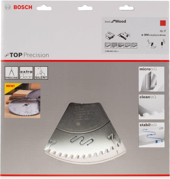 A Best for Wood körfűrészlap fa vágásának nehéz műveletei során ipari minőség elérésére alkalmas Extra Hard MicroteQ fogazata (amely a Bosch saját terméke) tartós keményfém szemcsékből készül, és kiváló minőséget nyújt. Cleanteq bevonata az anyagmaradványok tapadásának csökkentésével hidegen tartja a fűrészlapot, és védi a korróziótól A Stabilteq poliuret