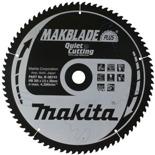 Makita Makblade Plus körfűrésztárcsa 355x30mm Z80 (B-08741) Makblade Plus tárcsák gérvágó fűrészekhez Az gérvágó fűrészekhez készített Makblade Plus tárcsák egyedi szabadalmai:Rezgés és vibráció csillapítást az egyedi kötésű, lézerrel vágott fogaknak köszönhetiSzupercsendes vágásExtra hosszú élettartam a volfram-karbid fogaknak köszönhetőenEgyedi súrlódás