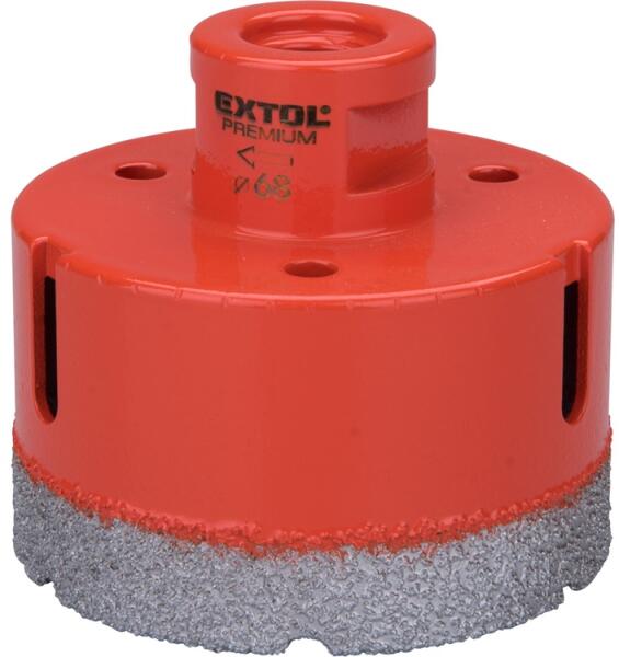 Extol Premium gyémánt körkivágó sarokcsiszolóra 68mm Extol Premium gyémánt körkivágó sarokcsiszolóra. Koronafúró körkivágó csempe, és hasonló anyagok vágására. Koronafúró festett acél alappal. Gyémánt szegmens 15mm, szemcseméret P35-40. Körkivágó M14-es menetes befogó tengely, ideális sarokcsiszológépekhez. Gyémánt koronafúró kiegészítő hűtés nélkül is