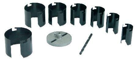 Fa, gipszkarton, műanyag vágására ajánlott Tartalmaz: tartót, 6 mm-es fúrót, 7darab koronafúrót a következő átmérőkkel: 26, 32, 38, 45, 50, 56, 63 mm