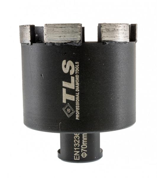 TLS MAGNUM szegmenses lyukfúró Átmérő: d=70 mm (M14 menetes csatlakozás) Szegmensmagasság : 10 mm Alkalmazás: vizes Alkalmazási terület: Kemény gránit, márvány, természetes kövek, gres, kőporcelán, csempe, kemény kerámiák, beton, stb. TLS MAGNUM szegmenses lyukfúró: - Hegesztett szegmensek - Kizárólag vizes használathoz - Legmagasabb minőségi fokozatú és speciális m