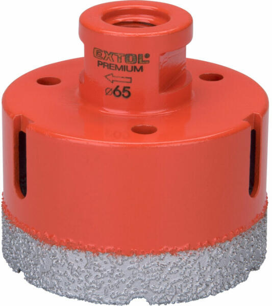 Extol Premium gyémánt körkivágó sarokcsiszolóra 65mm Extol Premium gyémánt körkivágó sarokcsiszolóra. Koronafúró körkivágó csempe, és hasonló anyagok vágására. Koronafúró festett acél alappal. Gyémánt szegmens 15mm, szemcseméret P35-40. Körkivágó M14-es menetes befogó tengely, ideális sarokcsiszológépekhez. Gyémánt koronafúró kiegészítő hűtés nélkül is