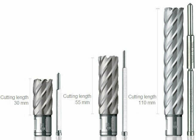 a test kiváló minőségű gyorsacélból készült, 8% kobalt (Co) hozzáadásával; a változó fogmintázat lehetővé teszi a változó keménységű anyagok fúrását; vágásmélység: 38 mm; masszív karosszéria-felépítés függőleges nyílásokkal a mag egyszerű eltávolítása érdekében; a fűrészfúrószár és a próbafúró gyors és egyszerű cseréje biztosítja a kényelme