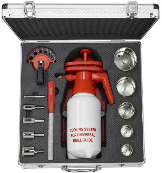 Száraz használatra akkus fúrókhoz 10 gyémántfúró Ø 8-18-22-25-32-35-38-50-60-73 mm Központosító Ø 4-5-6-8-10-12-14 mm Állítható vezető Ø 6 t/m 83 mm Hűtőrendszer 1,25 liter Kofferben szállítva Műszaki adatok ]]>