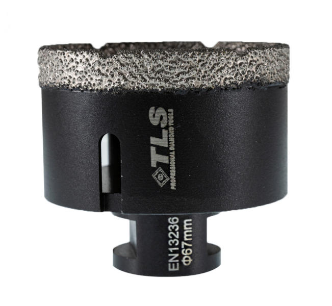 TLS COBRA gyémántszemcsés lyukfúró Átmérő: d=67 mm (M14 menetes csatlakozás) Alkalmazás: száraz és vizes Alkalmazási terület: Gres, kőporcelán, kemény kerámiák, gránit, márvány, természetes kövek, tégla, beton, szikla, egyéb építőipari anyagok TLS COBRA GYÉMÁNTSZEMCSÉS LYUKFÚRÓ : - Gyors, sima és precíz lyukfúrás - Rendkívül hosszú élettartam ( sokkal hoss