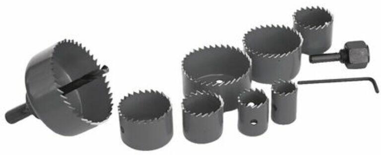 Vágási mélység 27 mm Átmérő: 19/22/29/32/38/44/51/68 mm edzett szerszámacélból 2 szár, 1 központi fúró és 1 imbuszkulcs műanyag tokban fához, színesfémekhez, építőlemezekhez és gipszkartonhoz.