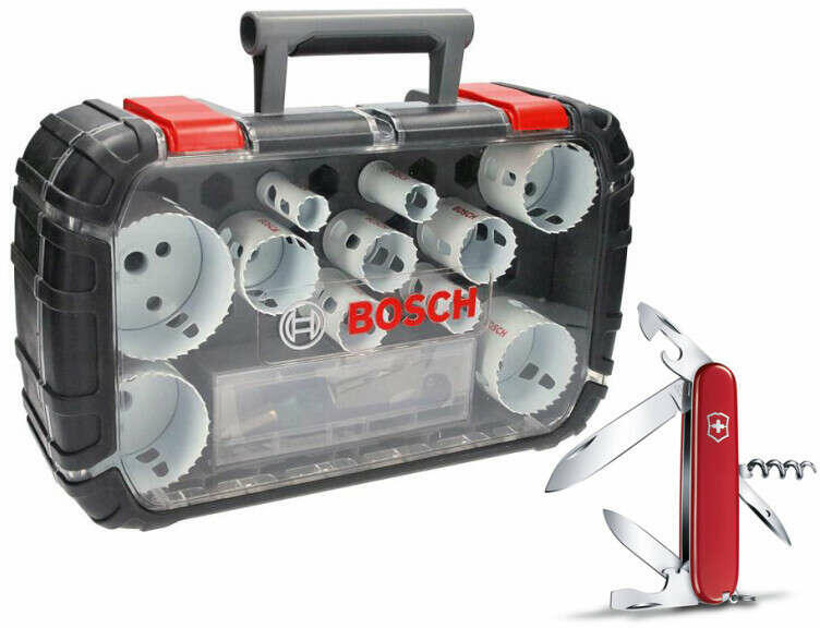 Körkivágókészlet: Átm érők: 20-22-25-32-35-40-44-51-60-68-76 mm Munkahossz: 60 mm 2 db központosító fúrószár (átmérő/hossz. ): 7,15/105 mm 1 db Power Change Plus hatszögletű adapter: 11 mm 12 funciós zsebkés: kis késpenge nagy késpenge csavarhúzó k onzervnyitó és csavarhúzó dugóhúzó sör és üvegnyitó vezetékblankoló bicska akasztógyűrű lyukasztó csipesz fogv