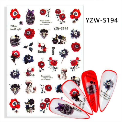 Halloween körömmatrica különböző halloween ünnepi alakzatokkal, koponyákkal a kreatív körömdíszítéshez. Vizesmatrica. Mindannyian lehetünk művészek, hála a matricáknak :) Néhány pillanat alatt különleges körmöket varázsolhatunk a segítségükkel. Hogyan díszítsünk körmöt vizes körömmatricával? Vá laszd ki a tetszőleges mintát, majd szorosan a minta mellett vá