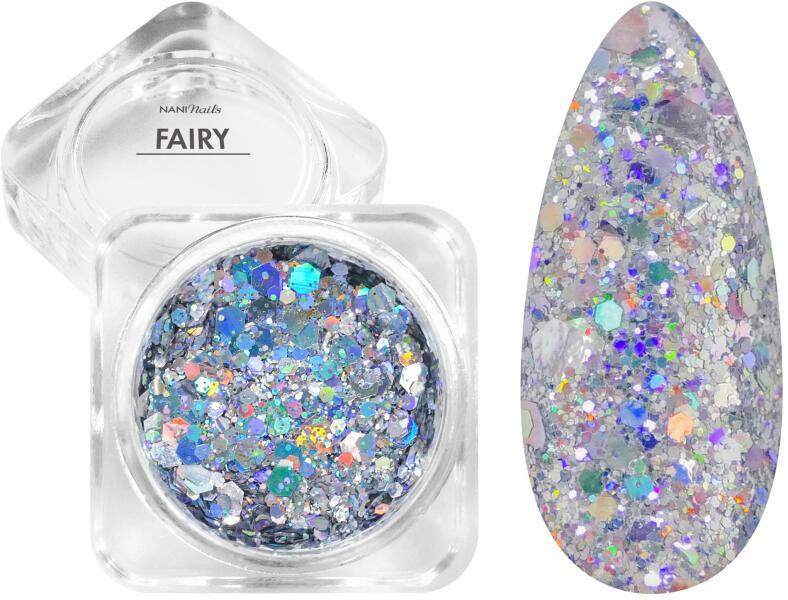 Látványos manikűr a Fairy körömdísznek köszönhetően. A csillámok gyönyörű kromatikus színárnyalatai csodálatosan feldobják a manikűrödet. Különböző méretű és színű csillámok egyetlen tégelyben a tökéletes wow hatáshoz. Használd a csillámokat a körmök teljes felületén vagy csillogó francia manikűrhöz – semmi sem szab határt az inspirációnak! zselés, p