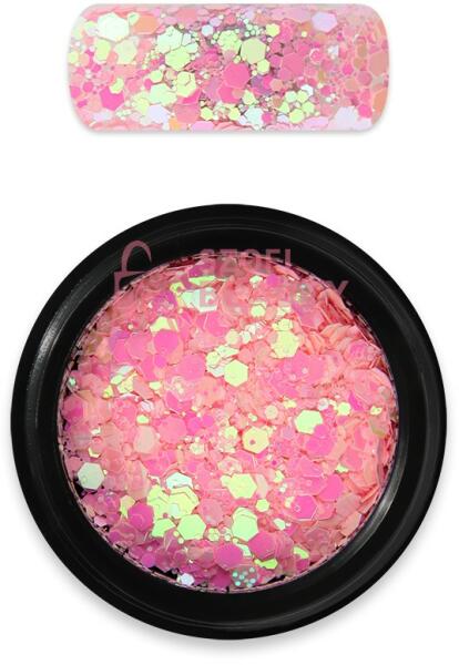 Különlegesen szép és csillogó, intenzív holografikus fénnyel ragyogó finom őrlésű csillámpor és hexagon glitter keveréke. A kisebb és nagyobb szemek együtt extra ragyogást biztosítanak. Gyönyörűen mutat a köröm teljes felületén, vagy kiegészítő díszítésként. Használható körömlakk és lakkzselé ragacsos felületén, fényzselébe, építő- és ragasztózselébe