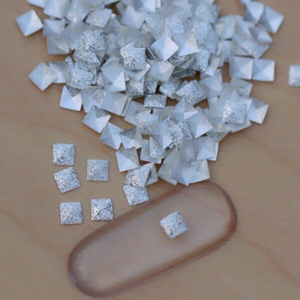 Szegecs körömdísz 3*3mm-es ezüst négyzet körömdísz. Csillámos felületű. Kreatívan kombinálható ezüst szegecs formáinkkal, fém, mágnesezhető szórógyöngyeinkkel.