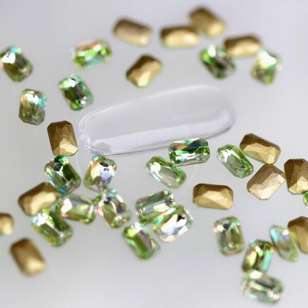 Strassz formakő Peridot ab színben hasáb formában egyedi dekorációkhoz. Az üvegdísz alul nem lapos, ezért elsősorban ékszerkészítéshez, kreatív dekorációkhoz ajánljuk.