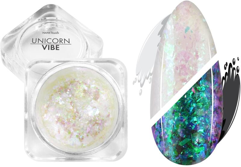 Az egyszarvús pelyhek a Unicorn Vibe kollekció jegyében tökéletes ragyogást adnak a manikűrödnek. Fehér, fekete és színes alapra egyaránt használhatók, és minden szögből más árnyalatot mutatnak. Imádni fogod! Praktikus, 3 x 3 cm méretű tégelyben. 0,2 g pigmentpor/kiszerelés. Használat: 1. A szokásos módon készítsd elő a körmöt – zsírtalanítsd, használj Primert,