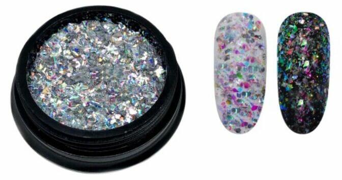 Csillogó és elbűvölő! Mintha csillagok táncolnának a körmeiden. Használata egyszerű, teheted műkörömre, vagy akár a saját körmödre is. A szabálytalan kis glittereket a géllakkod, körömlakkod, építőzseléd tetejére is rászórhatod. A tartós eredmény érdekében mindenképp használj fedésképen egy réteg fényzselét!