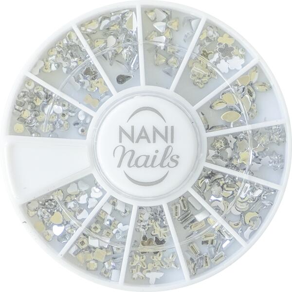 Díszítsd manikűrödet egyedi NANI körömdíszekkel – különböző minták többféle méretben és színben. elegáns kerek körömdísztartóban UV zselés és porcelán alapra is használható ezüst