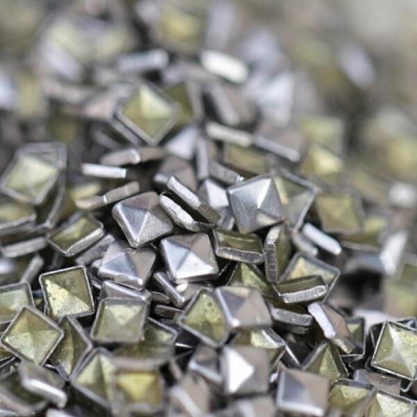 Szegecs körömdísz 3*3mm-es aluminíum négyzet hőre lágyuló ragasztóréteggel, ruhára is vasalható!. Kreatívan kombinálható ezüst szegecs formáinkkal, fém, mágnesezhető szórógyöngyeinkkel.