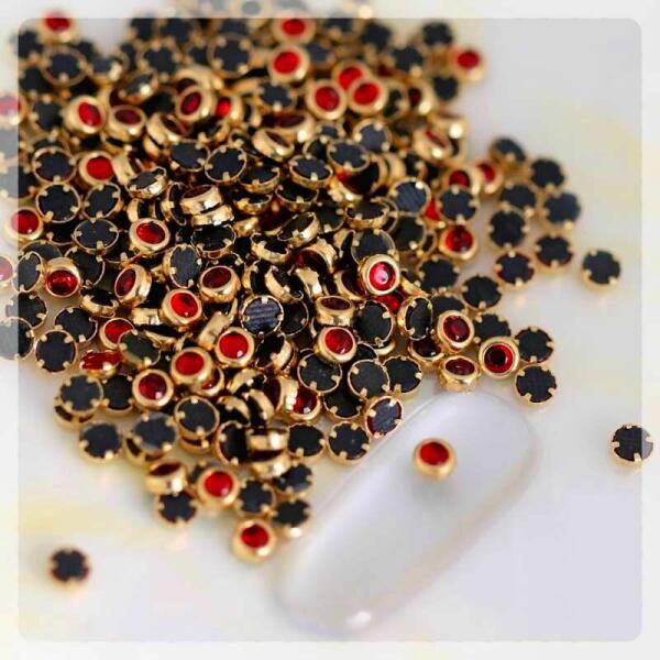 Pávaszem mini szegecs körömdísz, kis méretben, arany foglalatban piros kővel. Hotfixes lapos dísz, mely kreatívan felhasználható köröm vagy ruha díszítésére. Kíválóan kombinálható egyéb szegecseinkkel, szórógyöngyeinkkel, strasszköveinkkel.