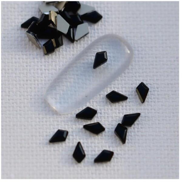 Strassz formakő pici deltoid Jet színben. Színvilága és egyedi formája végett sokrétű díszítő, körömre ragasztva vagy mandalák, ajándéktárgyak felületének dekorálásához kíválóan alkalmazható. Flatback no hotfix típusú üvegforma.