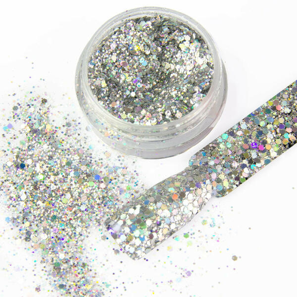 Az Elegance Effect körömpor Nr. 01 elegáns dekoráció, amely önbizalmat és ragyogást kölcsönöz Neked!Ízléses kiegészítőd lesz glamour stílusú manikűrödhöz! Ez egy csillogó, lézerezüst holografikus változatban. Tökéletes kiegészítője bármilyen színstílusnak. Fejezd ki magad és mutass kifejező megjelenést!A csillogó kiegészítők zseniális ötlet minden alkalomr