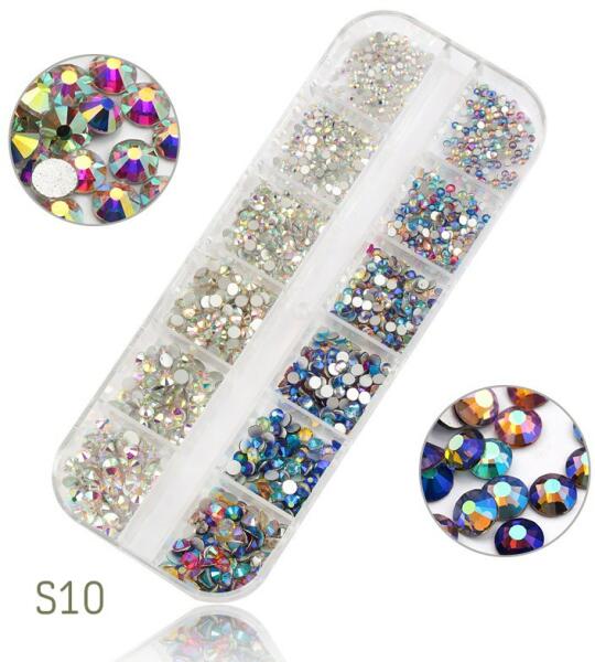 Különleges strassz kristály válogatás, ezüst alappal, amely normál nem ragasztós felületű. 1440 darabos kristály strassz készlet, 2 féle szín összeállításban, 6 féle méretben S10 használata: A köröm felületét a szokásos módon készítsük elő, majd alapozzuk le egy réteg alap gél lakkal. Köttetés után fessük a megfelelő színűre, ez lesz az alap. A szín köttet