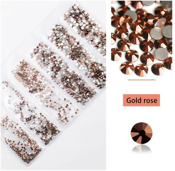 Különleges strassz kristály válogatás, ezüst alappal, amely normál nem ragasztós felületű. 1680 darabos kristály strassz készlet 6 féle méretben P18 - Gold rose használata: A köröm felületét a szokásos módon készítsük elő, majd alapozzuk le egy réteg alap gél lakkal. Köttetés után fessük a megfelelő színűre, ez lesz az alap. A szín köttetését követően, speci