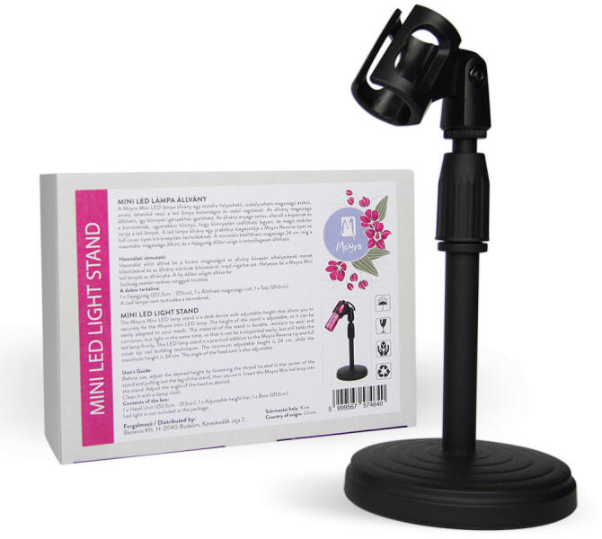 A Moyra Mini Led lámpa állvány egy asztalra helyezhető, szabályozható magasságú eszköz, mely lehetővé teszi a Mini Led lámpa biztonságos és stabil rögzítését. A doboz tartalma : 1 x Fejegység (Ø2,5cm – Ø3cm), 1 x Állítható magasságú rúd, 1 x Talp (Ø12cm) ALed lámp anem tartozéka a terméknek!