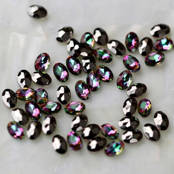 Strassz formakő fekete ab színben ovális formában egyedi dekorációkhoz. Az üvegdísz alul nem lapos, ezért elsősorban ékszerkészítéshez, kreatív dekorációkhoz ajánljuk.