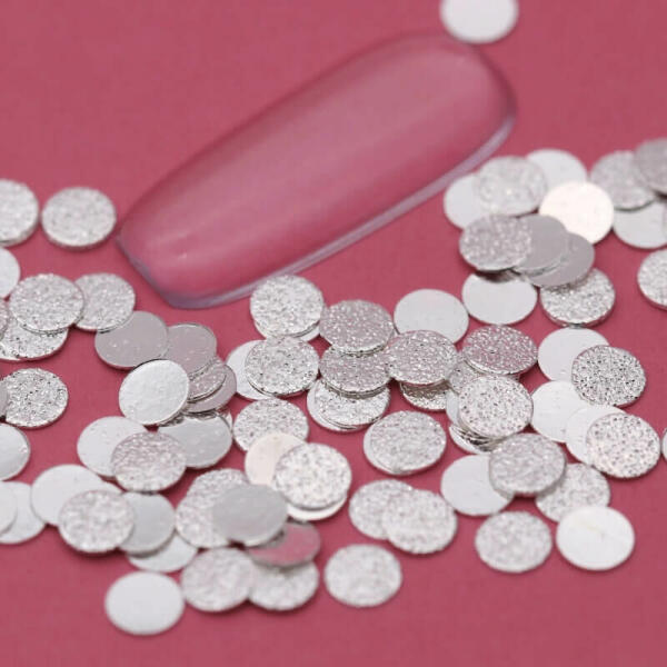 4mm-es ezüst, csillámos felületű korong körömdísz. Dekoratív díszítőelem. 40db/cs.