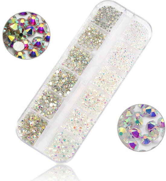 Különleges strassz kristály válogatás, ezüst alappal, amely normál nem ragasztós felületű. 1440 darabos kristály strassz készlet, 2 féle szín összeállításban, 6 féle méretben S7 használata: A köröm felületét a szokásos módon készítsük elő, majd alapozzuk le egy réteg alap gél lakkal. Köttetés után fessük a megfelelő színűre, ez lesz az alap. A szín köttet