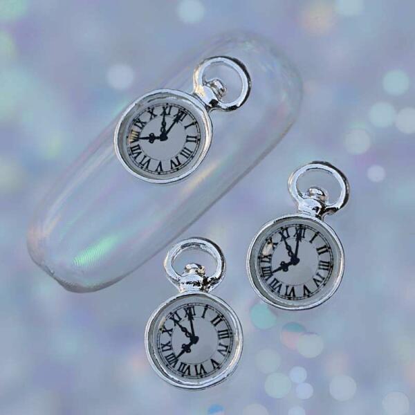 Körömdekoráció ezüst zsebóra fehér számlappal. Különleges díszítő, ajánlott extrém díszítésekhez, versenyekhez és mindazoknak akik úgy gondolják, náluk megállt az idő. Változatosan variálható ezüst színű fém szórógyöngyeinkkel, ezüst mini szegecseinkkel, de önmagában is feltűnő körömdísz.