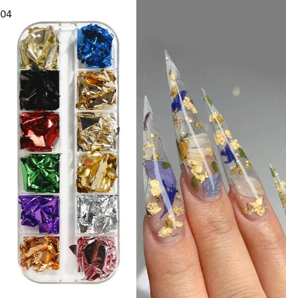 Leheletfinom, pehelykönnyű fólia darabok. Ragacsos felületre óvatosan felvihető, vagy beleépíthető különböző acrilokba, zselékbe.