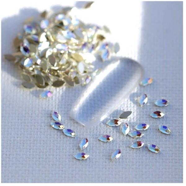 Strassz formakő mini crystal Moonlight zabszem. Színvilága és egyedi formája végett sokrétű díszítő, körömre ragasztva vagy mandalák, ajándéktárgyak felületének dekorálásához kíválóan alkalmazható. Flatback no hotfix típusú üvegforma.